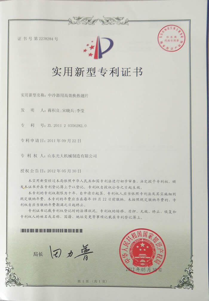 中冷器用高效换热翅片-实用新型专利证书