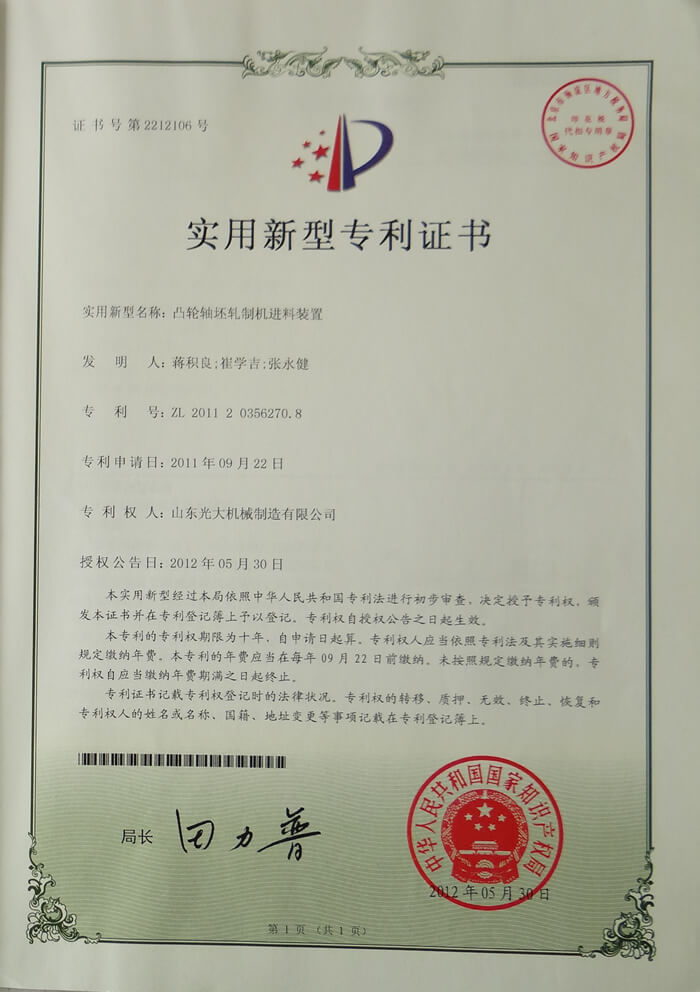 凸轮轴坯轧制机进料装置-实用新型专利证书